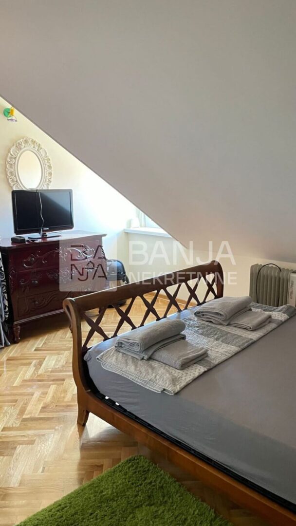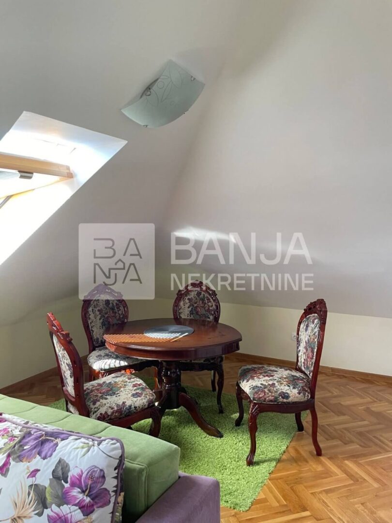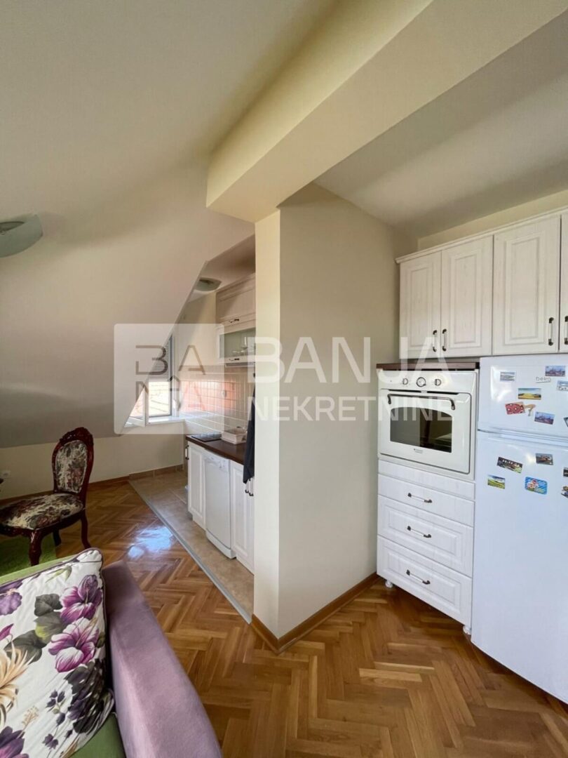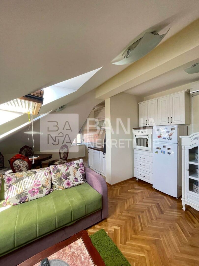 Ukoliko ste ljubitelj zelenila, blizine svih hotela, tako i Aqva parka, ovo je lokacija za Vas. Prodaje se stan od 38m2, sa dnevnom sobom koja je spojena sa kuhinjom, odvojenom prostranom spavaćom sobom kao i velikim kupatilom. Stan se prodaje nenamešten. Nalazi se na 4. spratu u potkrovlju gde postoji i mogućnost da se napravi i mini balkon. Parking je zajednički. Cena iznosi 65.000€.