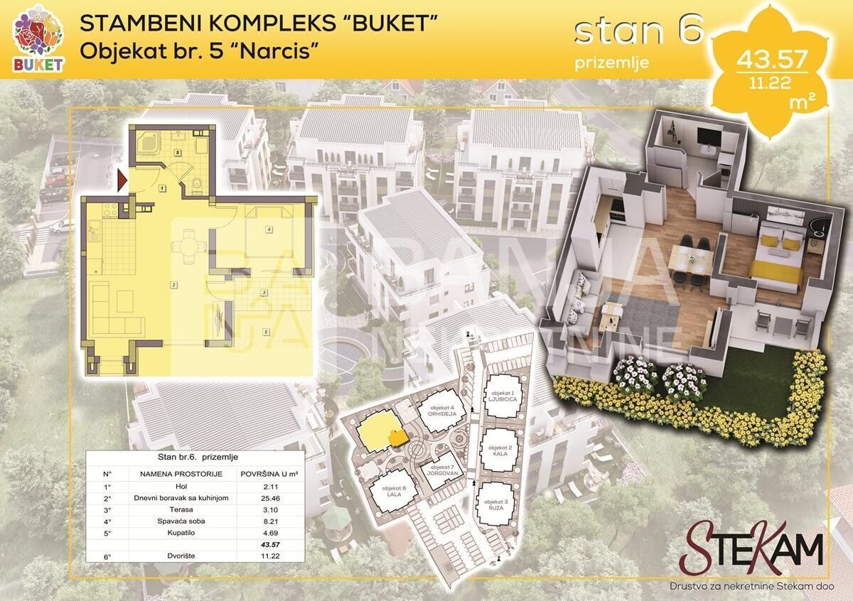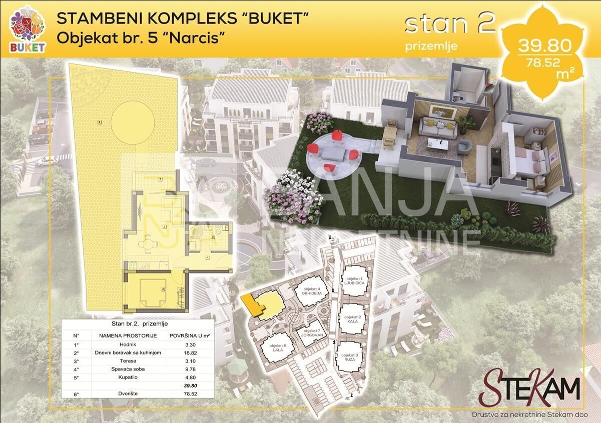 Deo stambenog kompleksa koji se nalazi na svega 270m od Aqua parka. Zbog blizine osnovne škole, vrtića, samoposluge i restorana, ova lokacija idealna je za život.